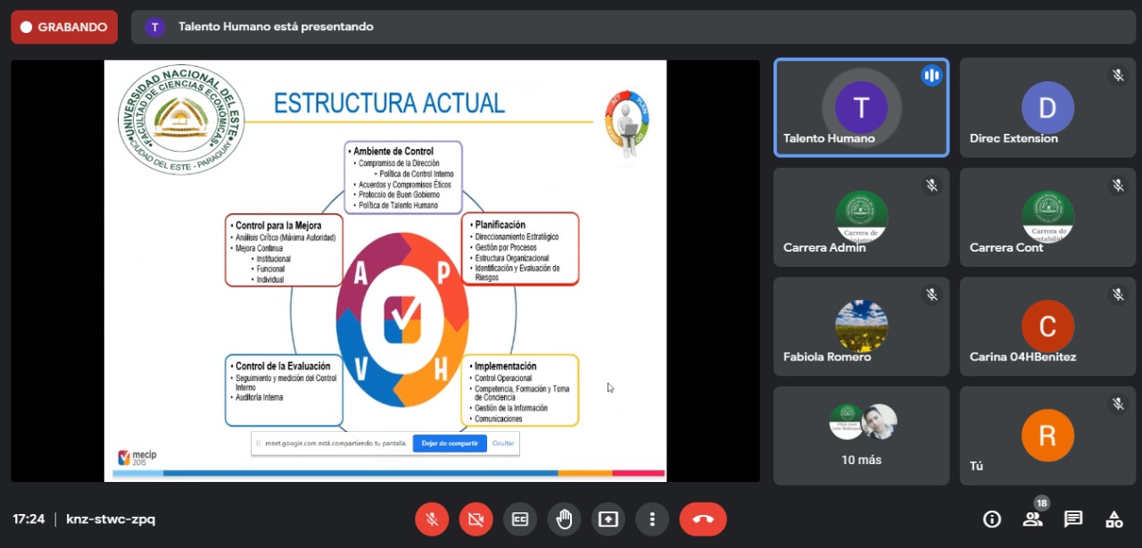 Los funcionarios de la Facultad de Ciencias Económicas participaron de una capacitación virtual sobre las Políticas de Control Interno, realizado el jueves 17 de junio. La formación estuvo dirigida por el departamento de Talento Humano y del MECIP.