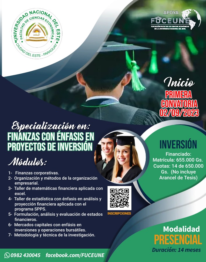 La Facultad de Ciencias Económicas (FCE) de la Universidad Nacional del Este con el apoyo de la FUCEUNE invitan a los graduados universitarios al Curso de Posgrado de “Especialización en Finanzas con Énfasis en Proyectos de Inversión”.La valorada propuesta de formación se desarrollará en la modalidad presencial en las instalaciones de la Sede Matriz de la Facultad de Ciencias Económicas en el Campus Universitario de la UNE de Ciudad del Este – Alto Paraná, los días sábados de 08:00 a 12:00 h. Comprenderá el desarrollo de siete módulos desarrollados durante catorce meses.