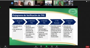 A través de una reunión online realizada este lunes 2 de noviembre, la Dirección de Investigación y la carrera de Contabilidad de la Facultad de Ciencias Económicas, coordinaron las revisiones de los Trabajos Finales de Grado (TFG), que serán presentados por los alumnos del 6to curso.
